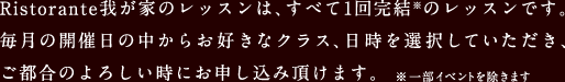 入会金・年会費などはございません。どなたでもお好きなクラス・日程にお気軽にお申し込みいただけます。レッスンはすべて1回完結のため、毎月、違うクラスにお申し込みいただくことも可能です。なお、男性の方はご紹介制とさせて頂いておりますのでご了承ください。